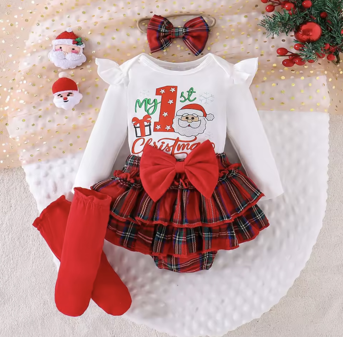hermoso set de navidad de bebé body, falda, par de medias y bincha